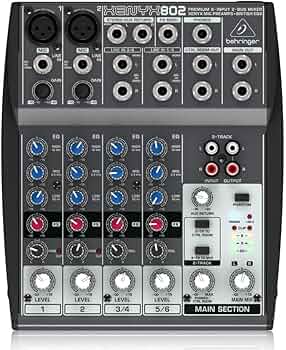 Mesa de mezclas Behringer Xenyx 802 con 2 canales mono y 2 canales estéreo. Preamplificadores Xenyx de alta calidad, ecualizador de 3 bandas, conexiones XLR y jack de 6,3 mm. Salida principal, salida de control room y entrada CD/tape con control de volumen. Dimensiones: 242 x 220 x 47 mm. Peso: 1,1 kg.